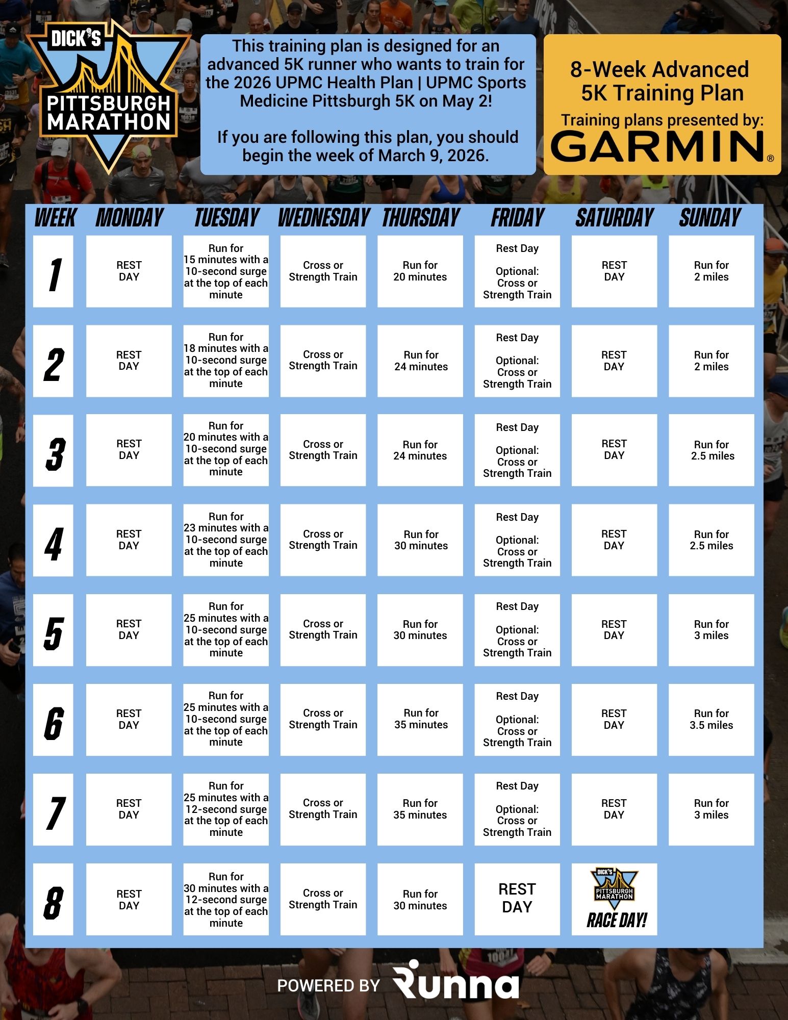 This 8-week intermediate 5K training plan is designed for someone with some running experience looking to improve their performance. If you’re using this plan, you should begin your training on March 9. - 8-Week Advanced