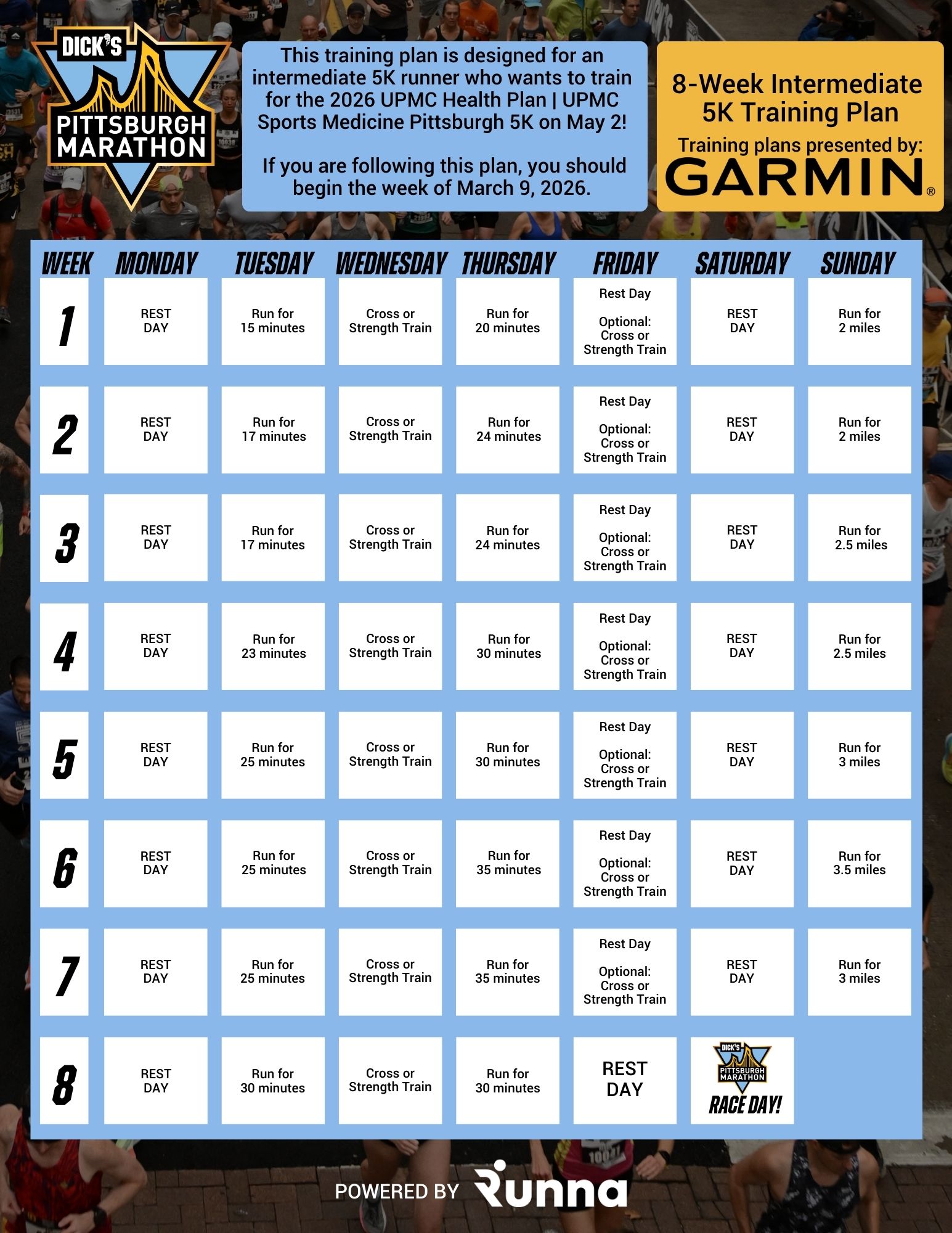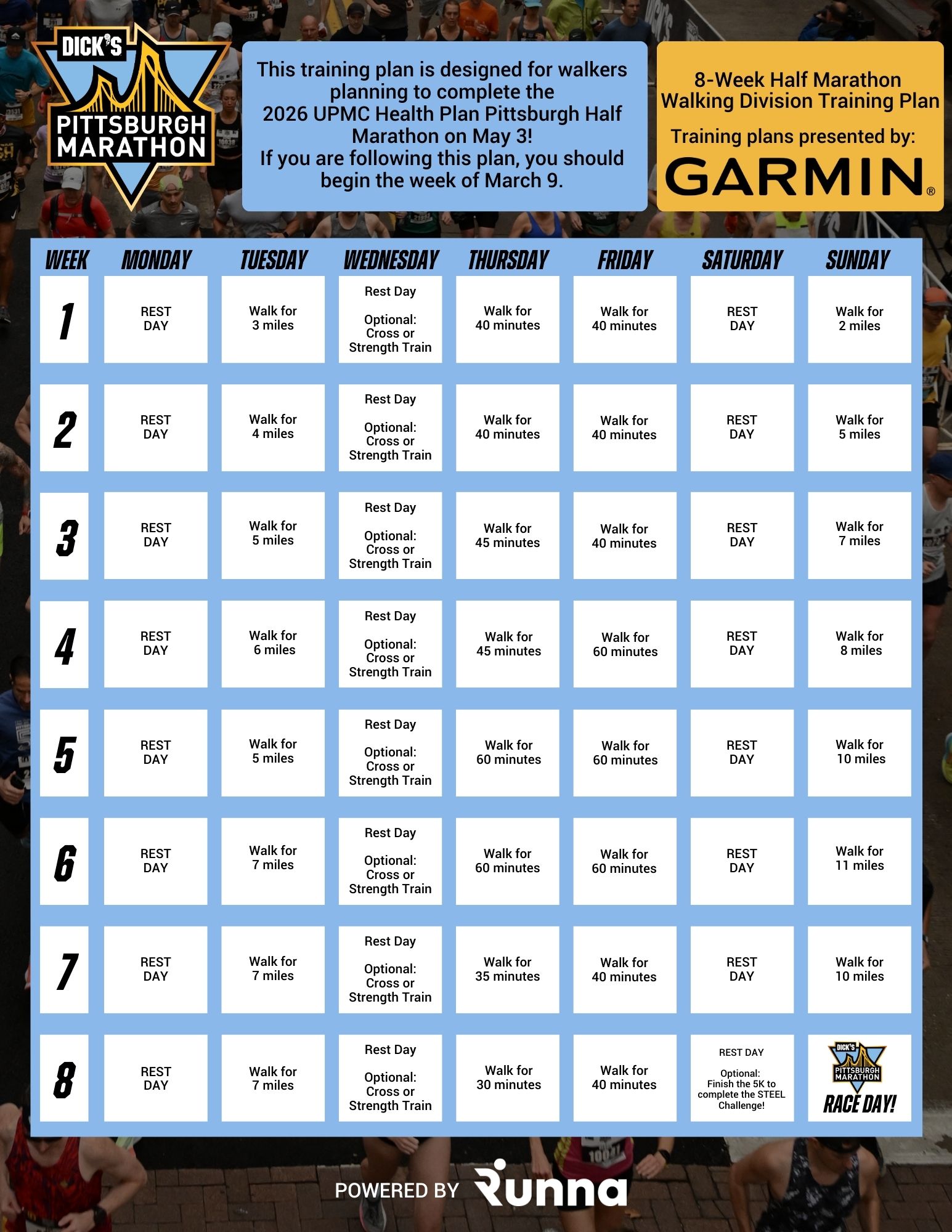 - This 8-week UPMC Health Plan Pittsburgh Half Marathon training plan is designed for someone looking to complete the walking division. If you’re using this plan, you should begin your training on March 9.