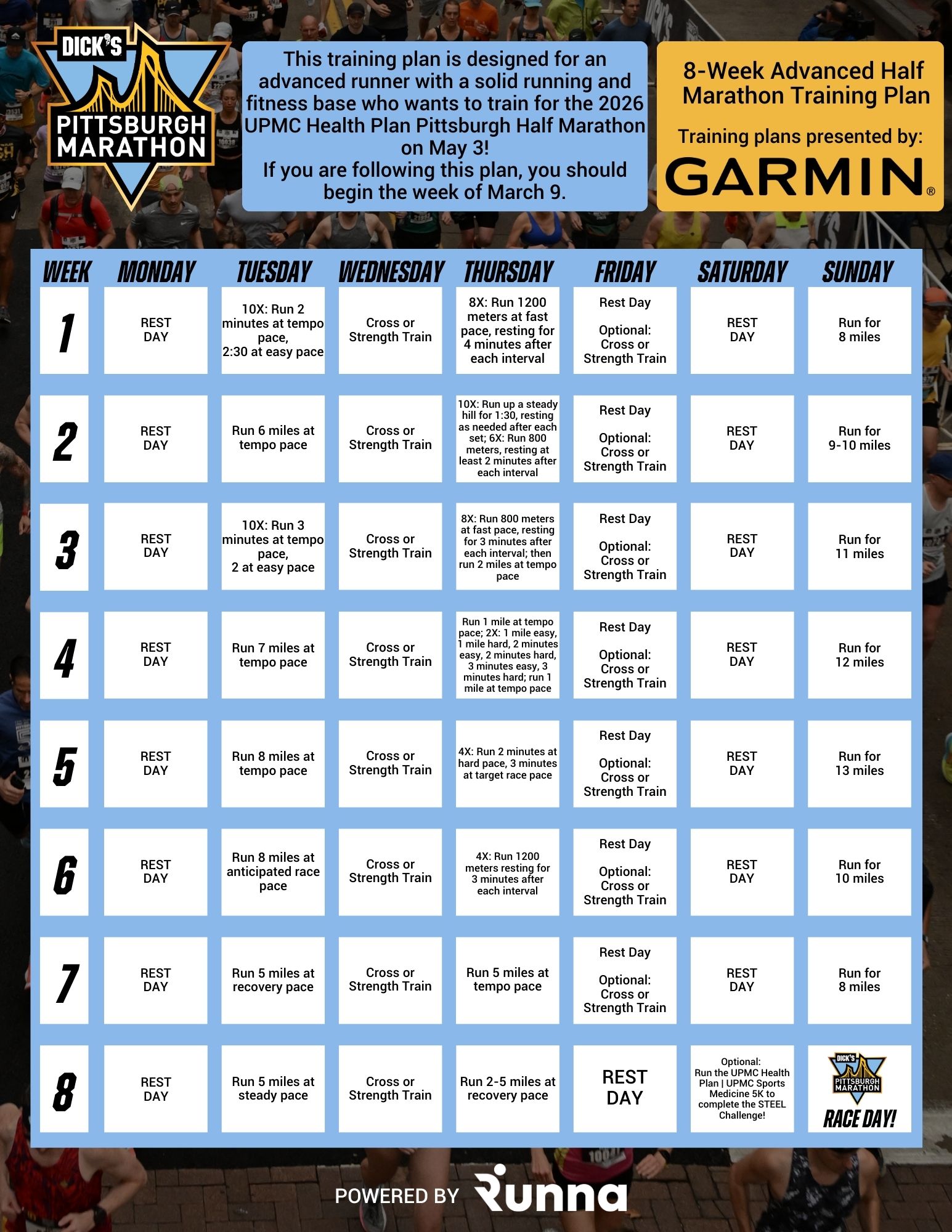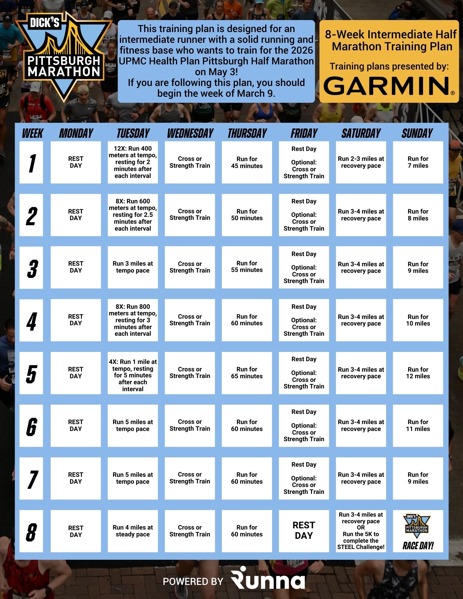 This 8-week half marathon training plan is designed for experienced runners looking to improve performance and already have a solid running base. Training begins on March 9.